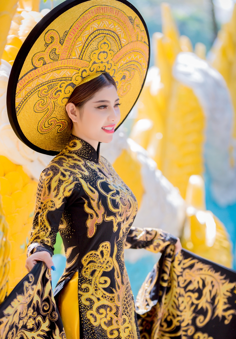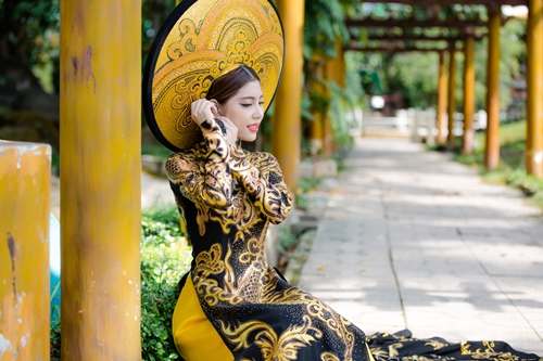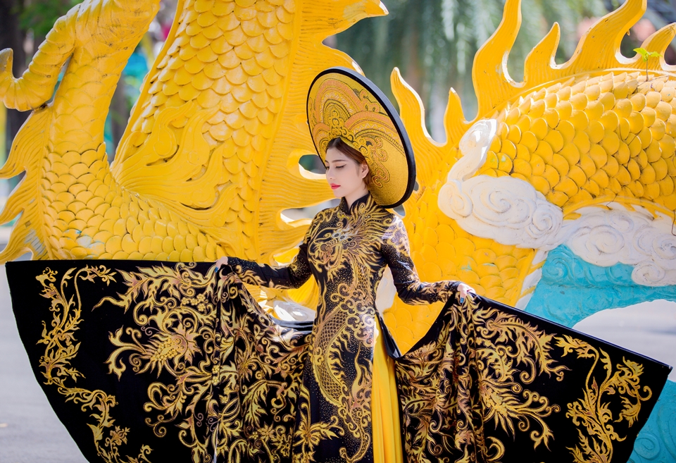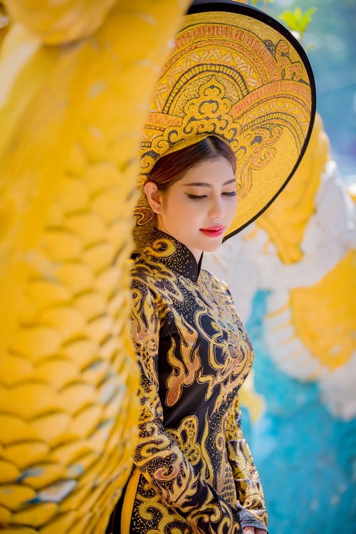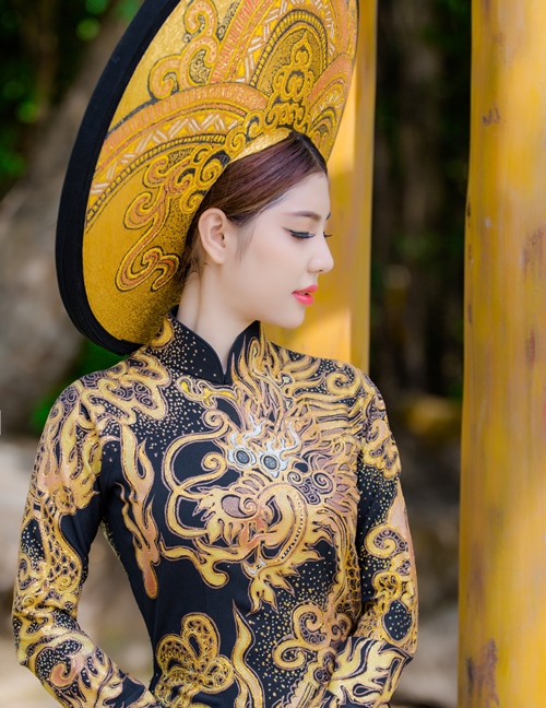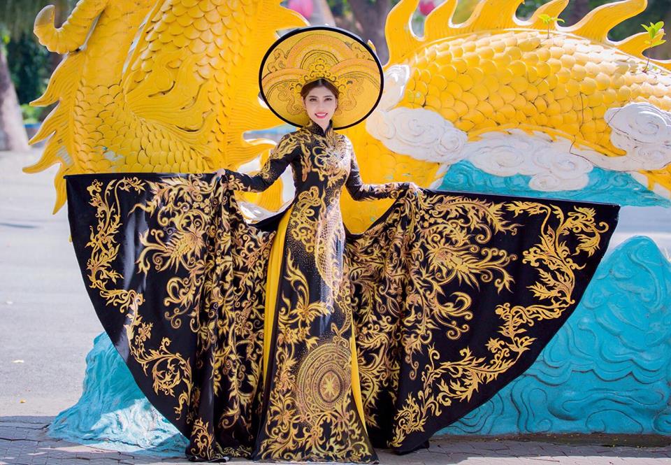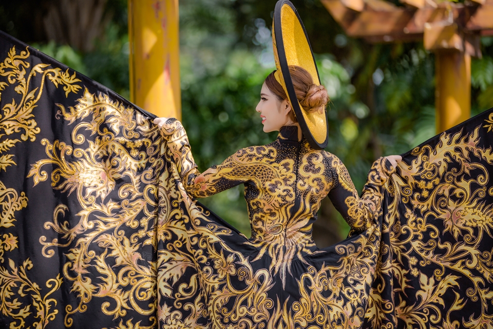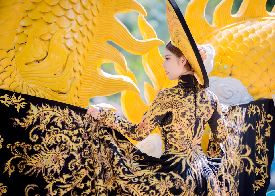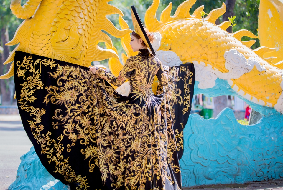 Đặc biệt, bộ áo dài lần này được thiết kế trên nền vải lãnh mỹ a đen có xuất xứ từ chính quê hương An Giang của Masary. Các hoa văn cung đình, rồng, phụng và trống đồng được thêu chỉ vàng dọc theo thân áo và tà áo tạo vẻ uy nghi, quý phái như các bà hoàng, công chúa ngày xưa.