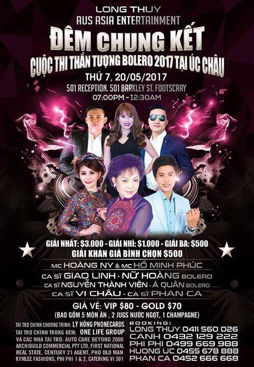 Anh Long Huỳnh thay mặt BTC và ca sĩ Giao Linh, đại diện Ban giám khảo lên trao giải Quán quân cuộc thi Thần tượng Bolero 2017 tại Úc cho thí sinh Tâm Nguyễn